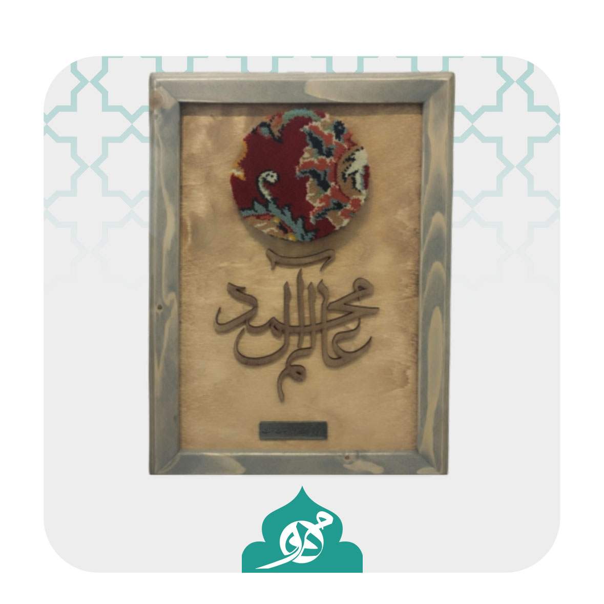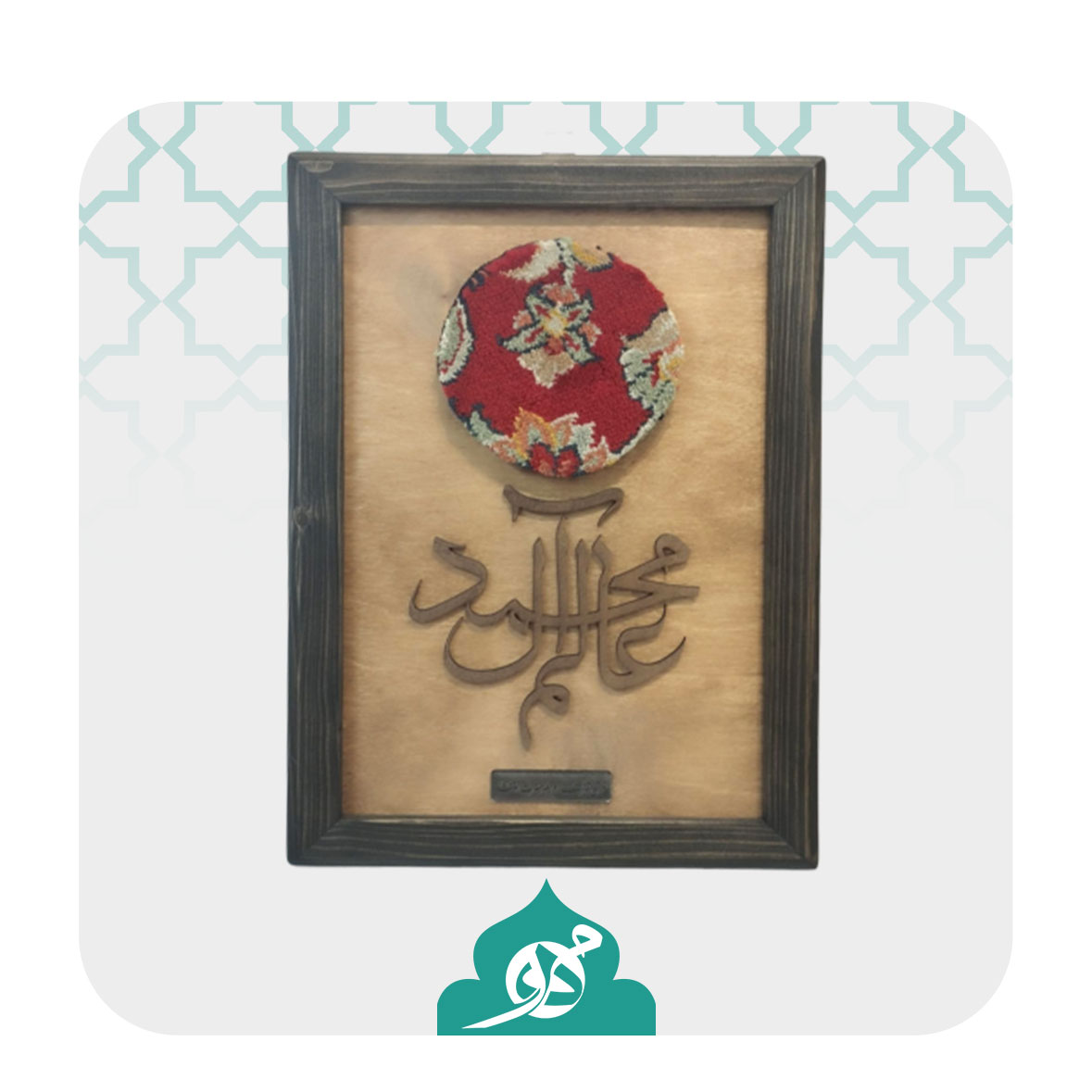 • نوشته معرق: عبارت «عالم آل محمد» با هنر معرق کاری زیر فرش قرار گرفته و پیام معنوی اثر را برجسته می‌سازد.