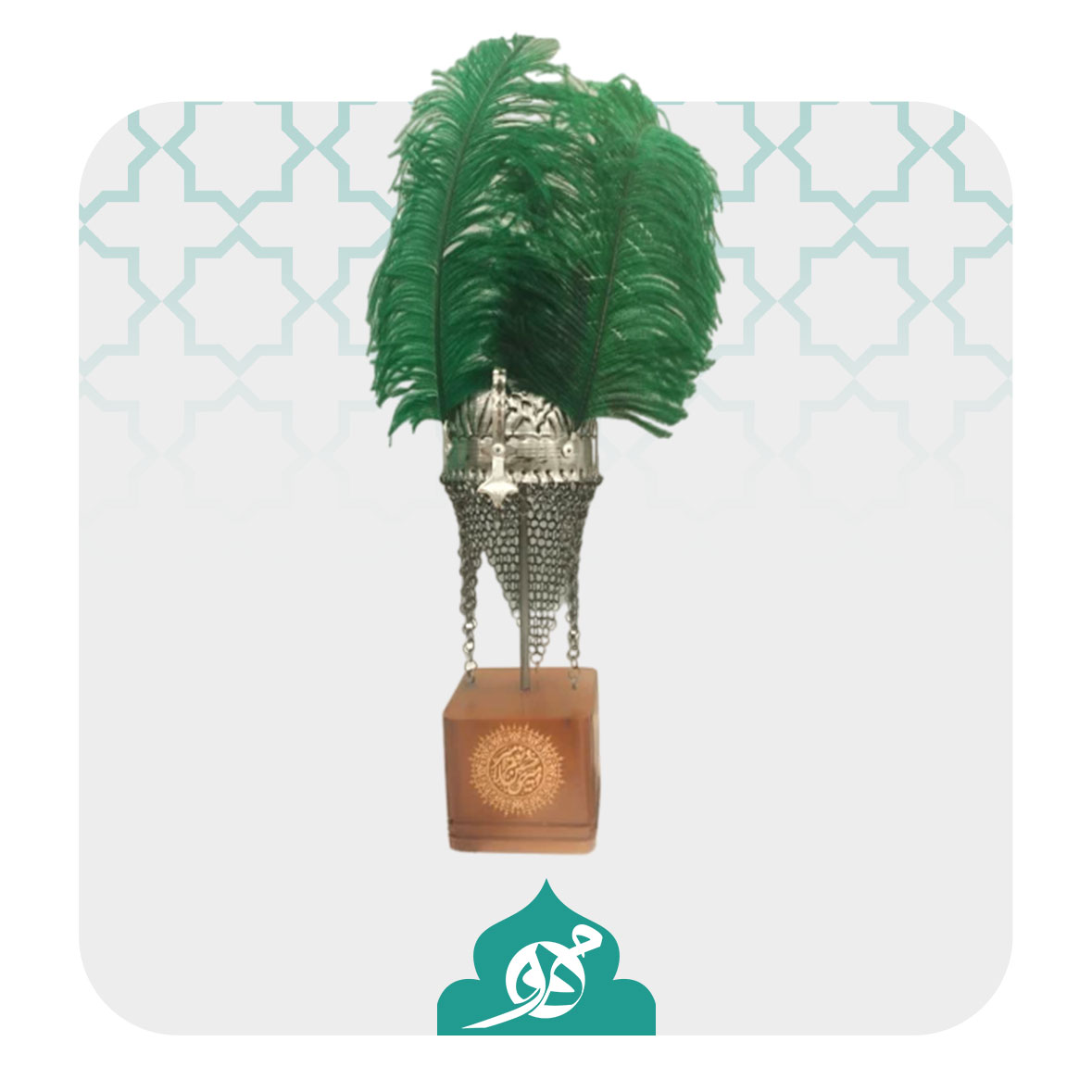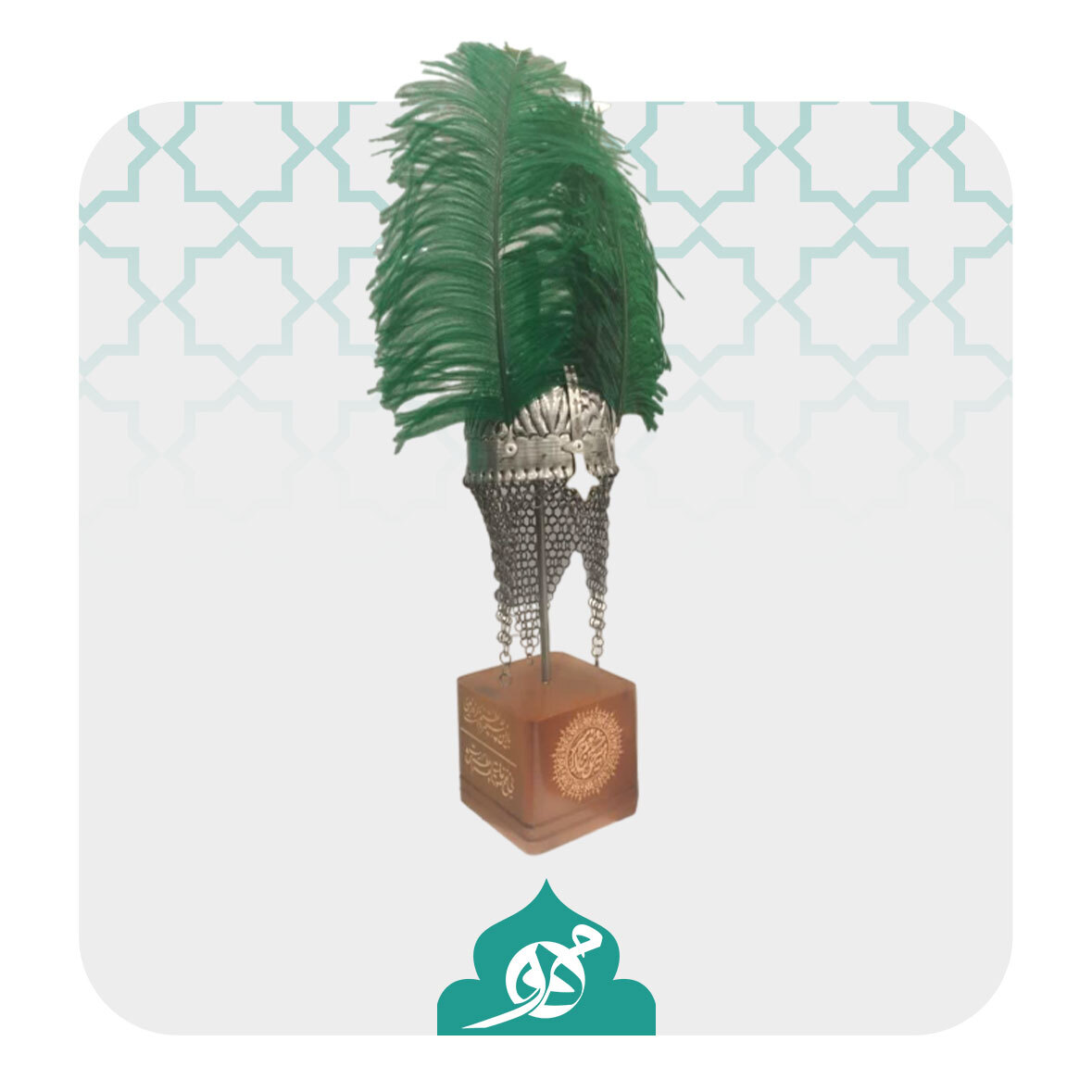 *تندیس رومیزی کلاهخود حدید تزیین شده با پر رنگی سبز و فلز کاری سنتی